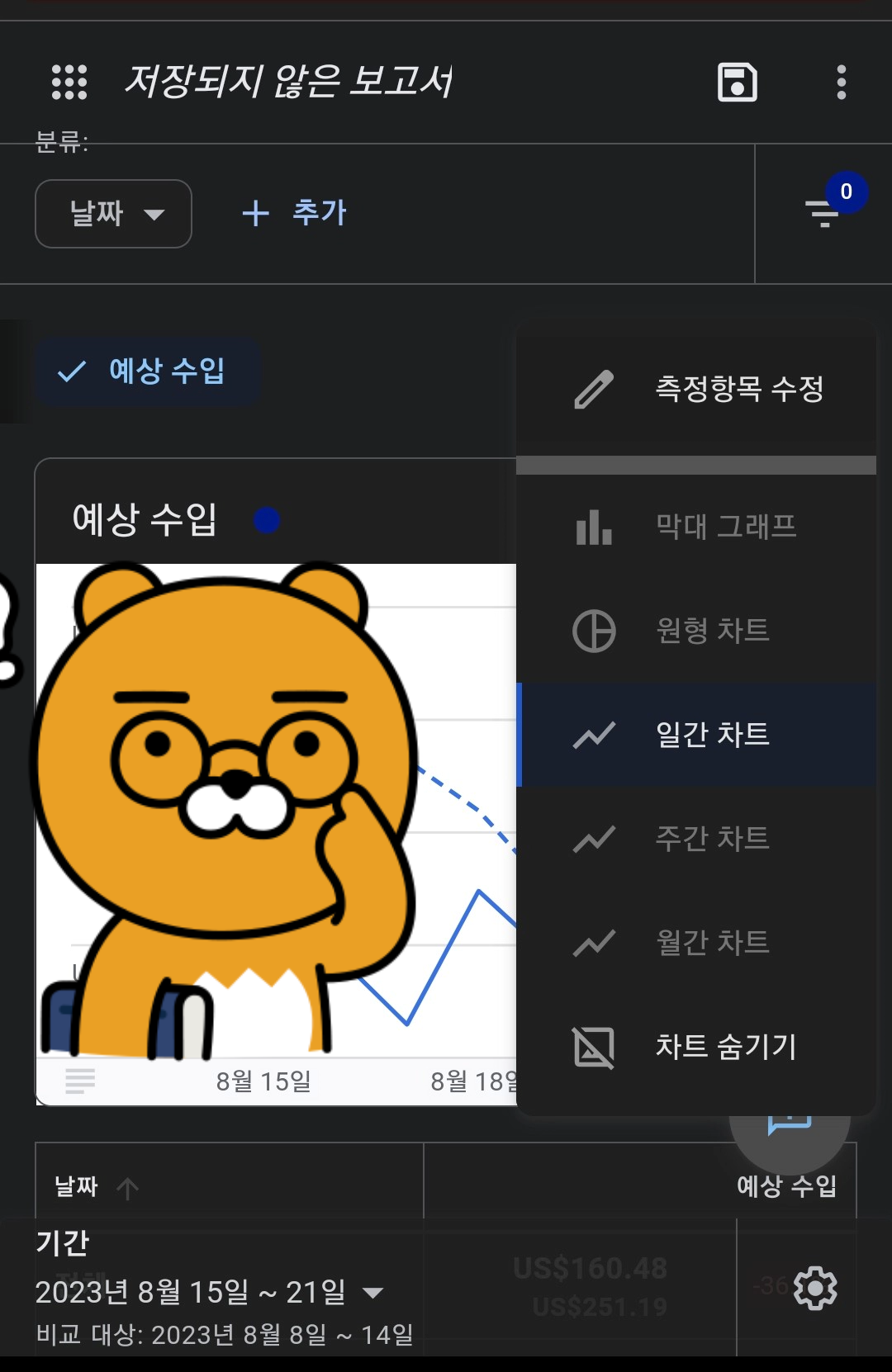 구글 애드센스에 접속하시면 왼쪽 상단 '예상수입'이란 반대편에 있는, 즉 오른쪽에 위치한 점 3개를 누르면, 아래 그림과 같은 검정 박스가 나타납니다. 그러면 '보고서 보기'를 눌러줍니다.