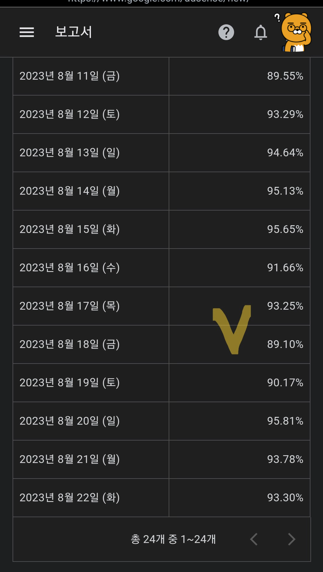 확인을 해보니 댓글을 남겨주신 날의 광고 게재 비율이 아래 이미지에서 보이는 것처럼 89.1%였네요. 제가 추정하기로는 이웃 블로거님께서 확인하는 시점에 광고 노출이 급격히 떨어지지 않았을까 하는 생각이 듭니다.