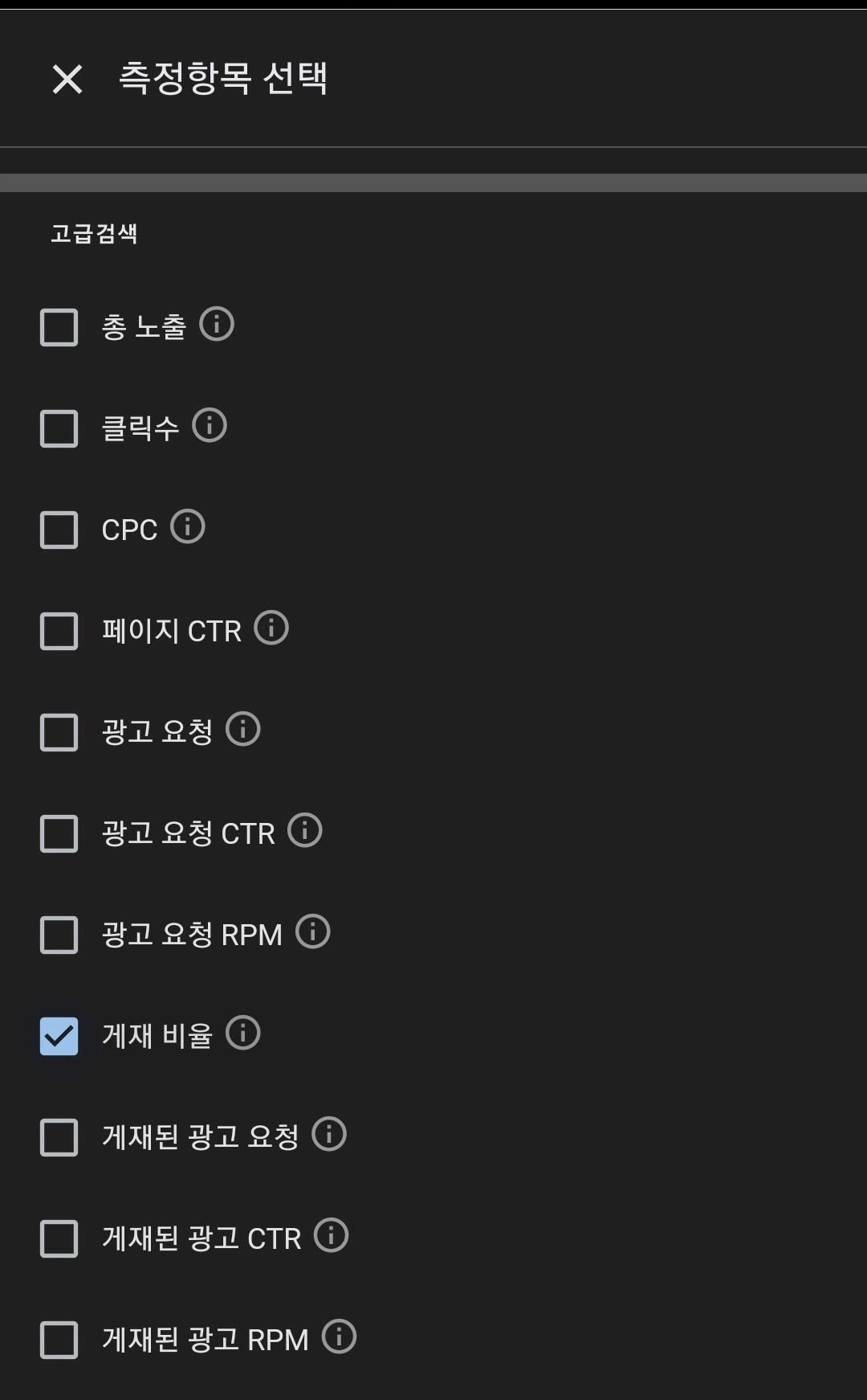 그러면 아래 그림처럼 측정항목을 선택할 수 있는데, '게재 비율'을 선택하여 클릭합니다.