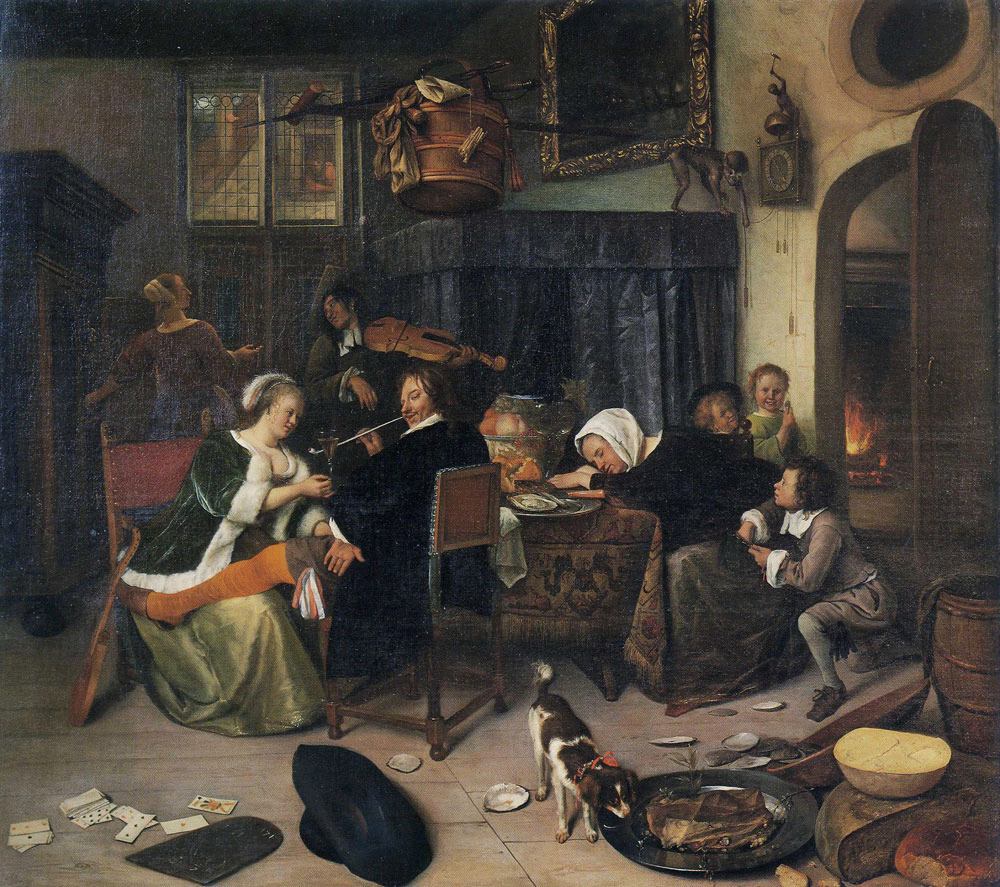 얀 스텐(Jan Steen, 1626-1679)이 그림의 주제로 가장 선호했던 것은 일상의 풍경입니다. 일상생활을 주제로 그림을 그렸던 얀 스텐은 네덜란드 화가들 중에서 관찰력이 가장 예리하고 유머 감각도 아주 탁월했습니다. 그는 그림을 그리는 것으로만 생계를 유지할 수 없어서 여관을 경영하였는데, 이런 경험을 통해서 사람들의 행동에 대한 날카로운 통찰력을 얻을 수 있었습니다. 그는 농촌과 중산층 시민들의 삶 속에서 볼 수 있는 익살스런 소재를 그림에 담으면서 도덕적인 교훈을 여러 상징을 통해 표현했습니다. 예를 들면 즐겁고 유쾌한 쾌락적인 삶을 그려놓고서는 앞으로 이러한 삶이 가져올 미래에 대해서 은근히 경고하는 식이었지요.