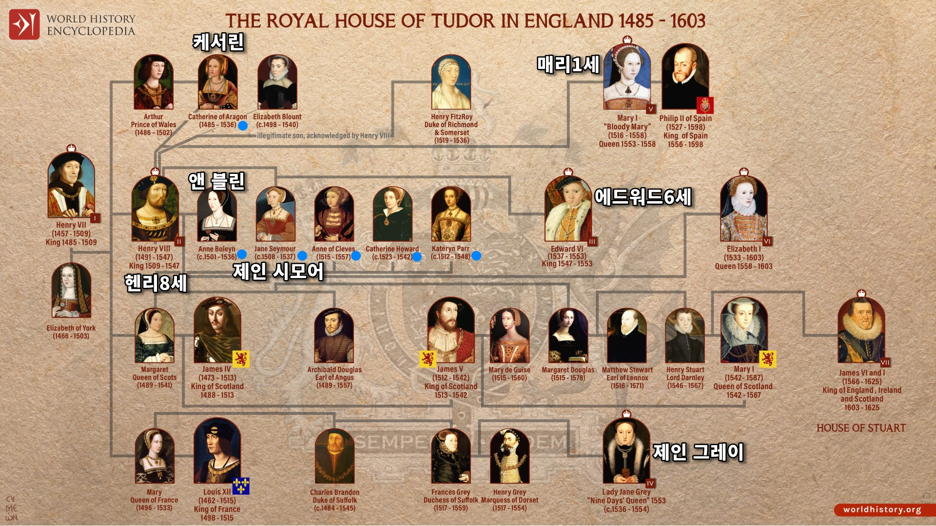 이 그림 속의 주인공 제인 그레이는 단지 9일 동안 왕위에 오른 뒤 참수형을 당한 비운의 여인입니다. 왜 이런 참수형을 당해야 했는지 알기 위해서는 당시 영국 왕실의 가족들을 알아야 합니다. 그래서 가계도를 준비했습니다. 핵심 인물은 한스 홀바인의 <대사들>에 등장했던 헨리 8세입니다. 이미지 안에 파란 점은 헨리 8세의 아내들입니다.